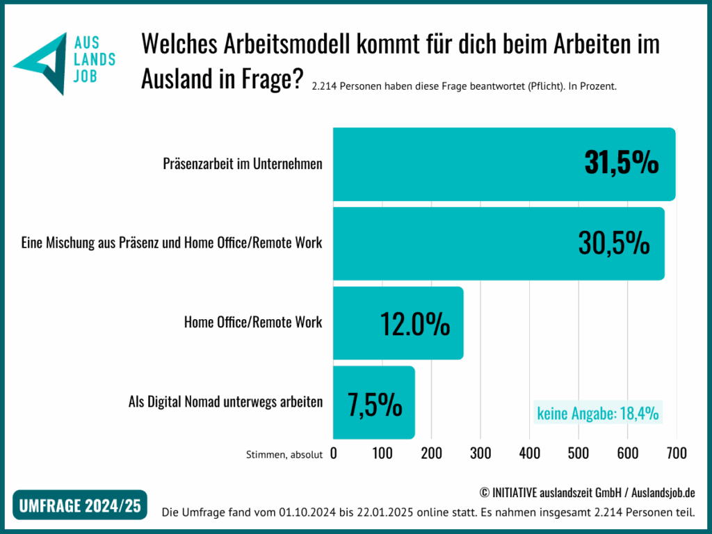 Außerdem hat Auslandsjob.de in ihrer aktuellen Studie zu den „Wünschen und Motiven rund ums Arbeiten im Ausland“ herausgefunden, dass das Thema Remote Work für jeden Dritten von Wichtigkeit ist.
